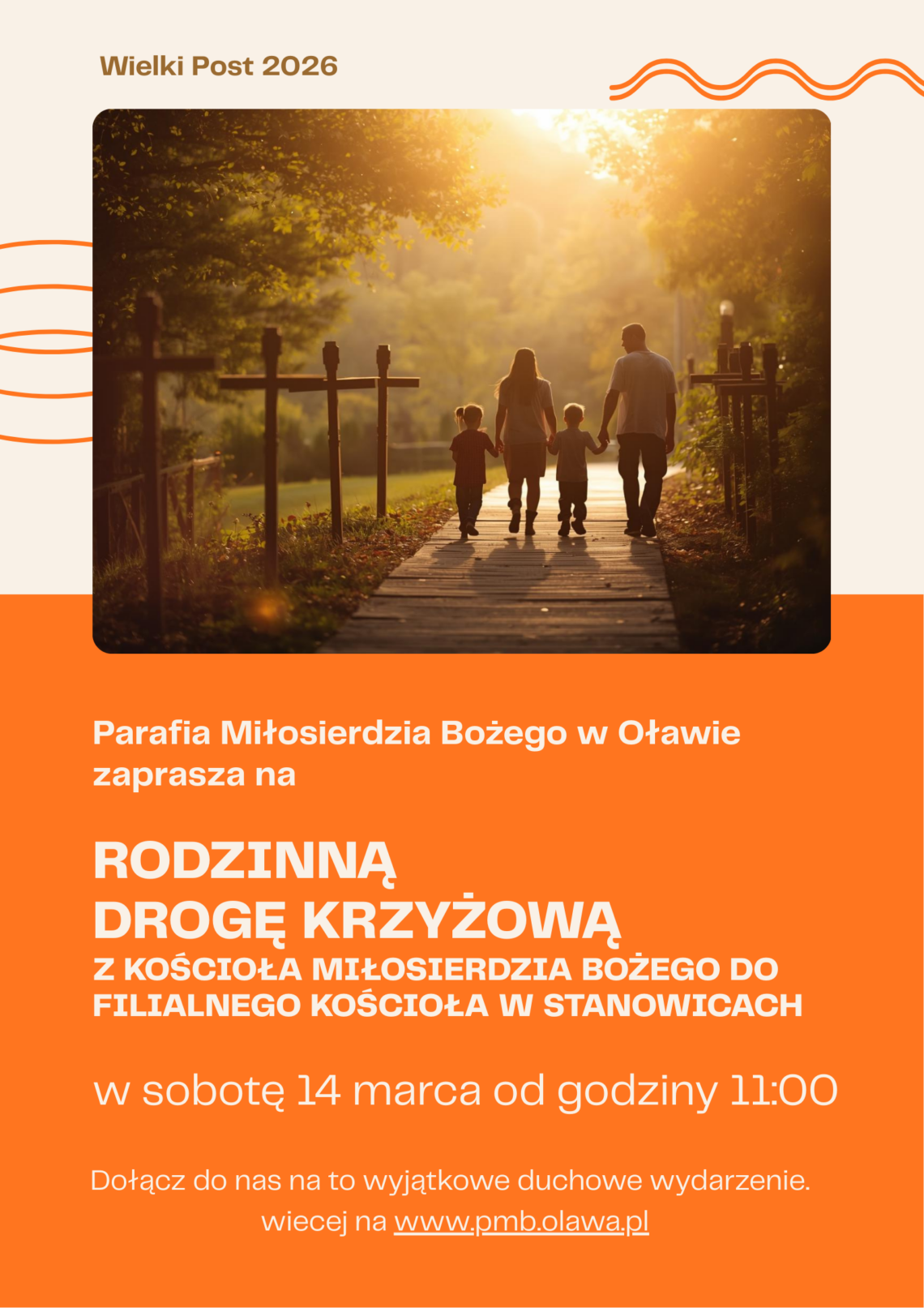 14.03.2026r. (sobota), start godz. 11.00 – 11.30 – Parafia Miłosierdzia Bożego w Oławie (ul. Zaciszna 4), zakończenie ok. godz. 13.00 – Kościół w Stanowicach (ul. Stanowicka 42)